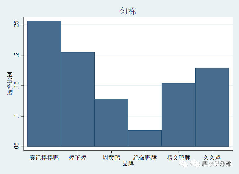 假设我们有这样的一个调查数据,如上图所示,该数据包含3个变量:调查对象(ID),卤味品牌(brand),还有调查对象的体型(somatotype)。现在我们要对这个数据进行处理,找出各个体型的人对卤味品牌的偏好,并用图形描述出来,如下图所示,即是体型匀称的人对个卤味品牌的偏好,他们最爱廖记棒棒鸭,绝命鸭脖的追捧程度最低。