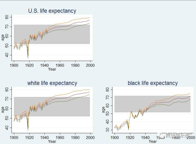 就上面的例子,如果我们是想比较美国整体、白人和黑人之间的预期寿命的差异,可以将所有的图形组合在一起,具体命令行如下: