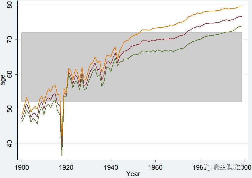 twoway rarea z1 z2 year,color(gs12)||line le_w year||line le_wmale year ///