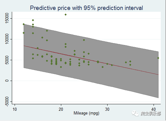 大家还记得在推文“area & rarea——我填了谁的阴影”的文末,我们介绍了用命令rarea绘制置信区间的例子吗?今天小编要告诉大家的是,在预测分析的案例中,为了更好的评价预测的好坏,我们还需要绘制预测区间,而且在预测区间中添加预测曲线和实际值的分布,能更好的说明问题。那如何实现呢?请看下面的具体代码:
