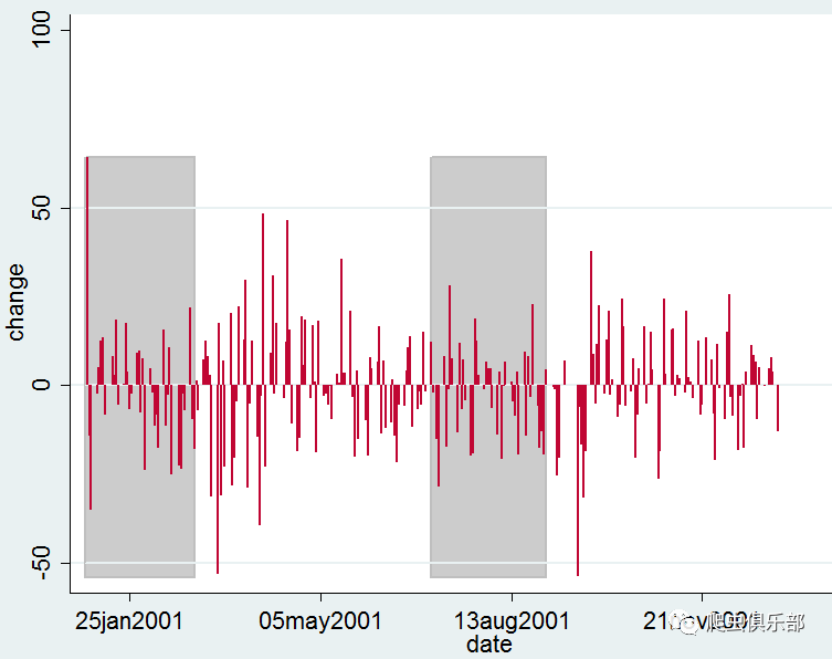 注:命令中y的值是变量change的最大值;选项base中是变量change的最小值;选项range中的数值分别是变量date的值。