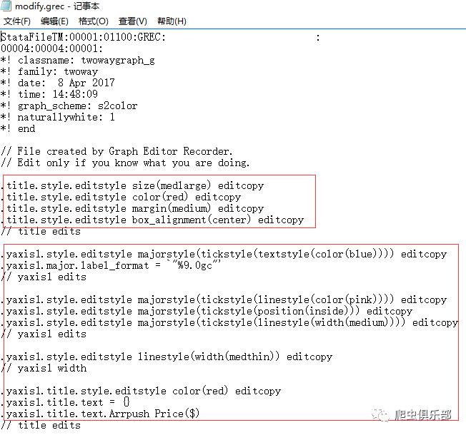 此时,打开文件modify.grec,可以看到相关命令语句已生成,限于篇幅原因我们仅展示图形标题和纵坐标的修改如下图所示: