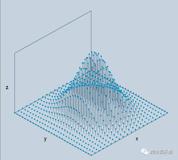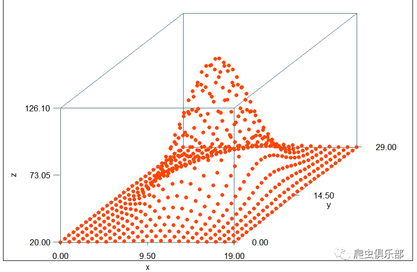 与graph3d相比,surface生成的图形自带长方体框、坐标轴名称及坐标数值,并将所有的数据点连接起来,如果我们想去掉连接线的话可以使用nowire选项:
