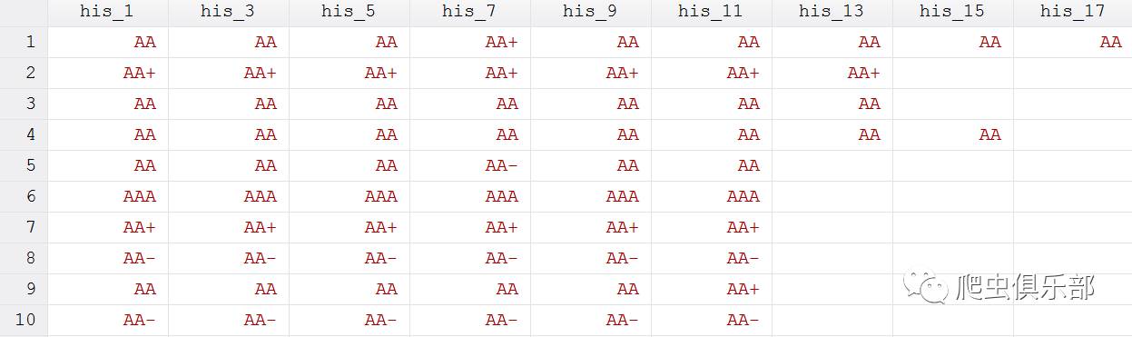 可以看到,每一条观测值都包含有同一个公司不同日期的评级,我们需要把变量“历史债项评级”拆分为公司名称、日期以及对应的评级。如下图所示: