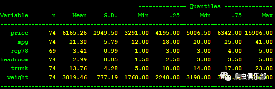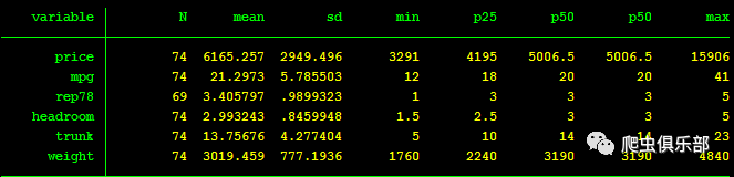 tabstat price mpg rep78 headroom trunk weight,s(n mean sd min p25 median p50 max)