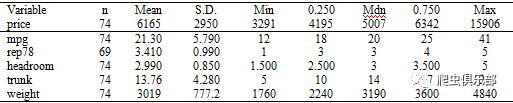 通过help tabstat,我们可以通过s()选项输出其他统计量。如下程序可输出变量的观测值数量、均值、标准差、最小值、四分位数以及最大值。