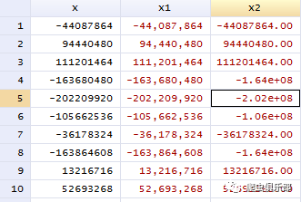 如图,我们发现x2中有一些字符型数值转变为科学计数法了,这主要是因为x2变量的列宽度为12,如果我们强制显示两位小数的话,所显示的数字列宽超过了12位,这时,只要改变显示格式即可。