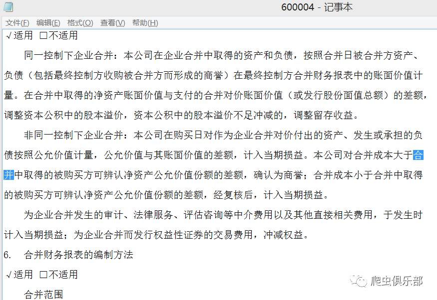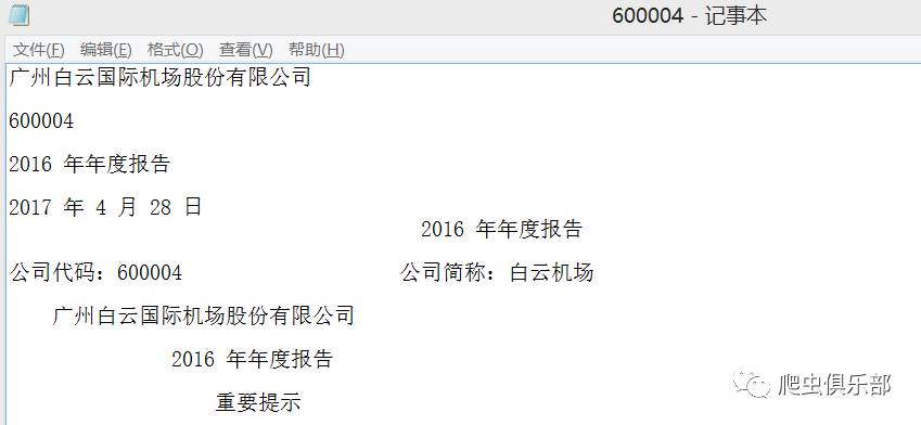 这 里统计出来的“合并”一词为162个,而文章开头统计的个数为161,说明被分在两行的“合并”被统计到了。这时候我们又发现一个问题,在stata编辑 框中“2017年4月28日”与“2016年年度报告公司代码:600004”之间依然有一些空白字符,为了方便观察,下边给出对应的文本文档: