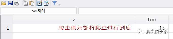注意了!我们点击v[1]这个观测值,在stata的上方的编辑框中却只显示“爬虫俱乐部”!好是奇怪,我们接着看一下,这个观测值的unicode字符长度: