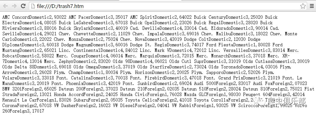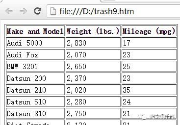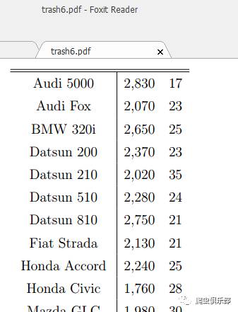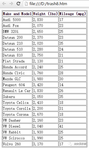 (mpg)</th></tr>") foot("</table>") //将满足条件的变量用html格式分割并保存到d:/trash8.htm,同时添加表头head()和脚注foot()