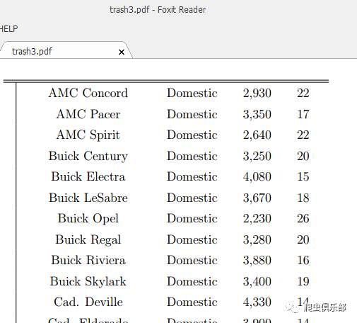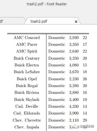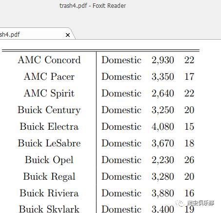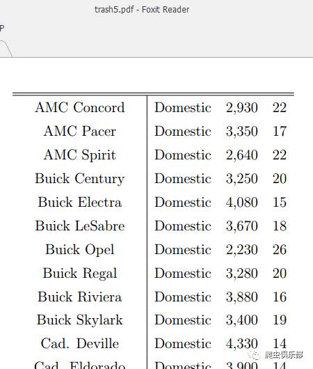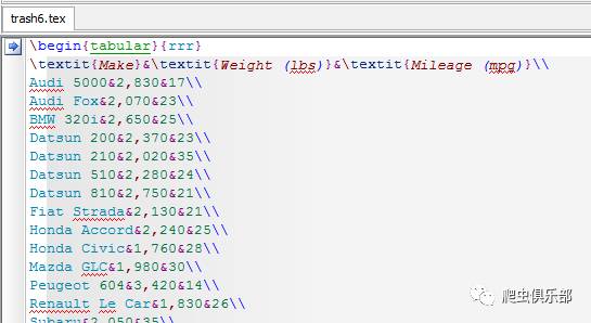 (mpg)}\\"') foot("\end{tabular}") //将满足条件的变量保存到d:/trash6.tex,并且添加表头head()和脚注foot(),textit()是对每一列的属性说明,也就是变量名称
