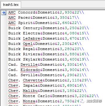 listtab make foreign weight mpg using d:/trash4.tex, rstyle(settabs) replace //将变量的观测值用settabs (可变)格式分割并保存到d:/trash4.tex