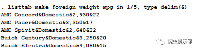 listtab make foreign weight mpg in 1/5, type delim(&) //变量的观测值之间用&分割