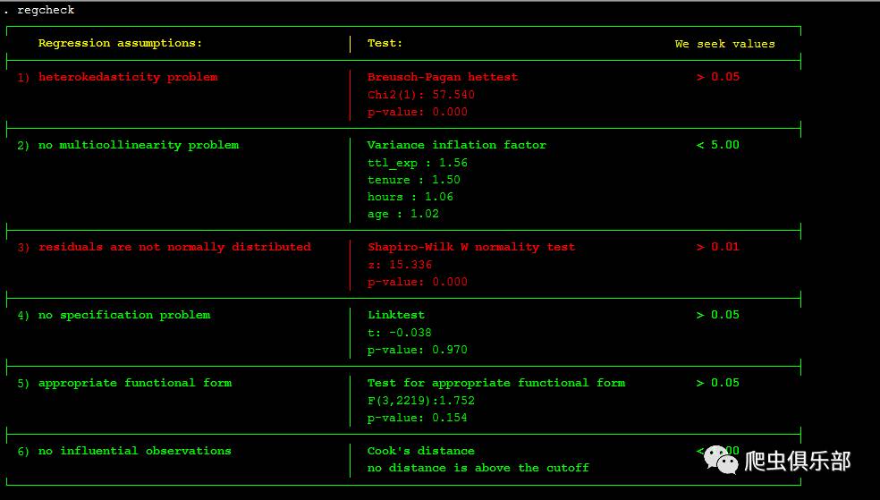 在这里跟大家简单解释一下regcheck命令:regcheck命令可以快速检验6个线性回归的假设: