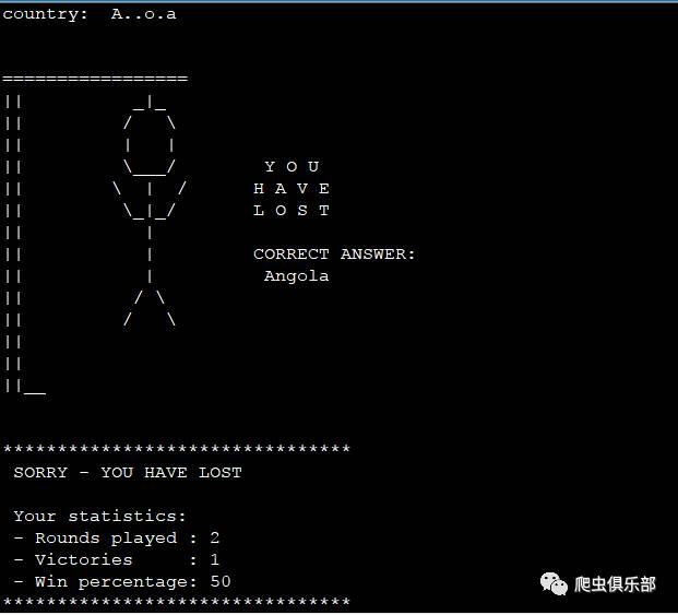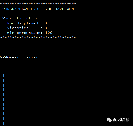 这时候系统会提示你通过游戏(you have won),并且宣布游戏次数、游戏成功次数以及成功占总次数的比例,同时结束本次游戏,开始进行新的游戏,新游戏需要你猜出目录为country下的长度为6的单词。