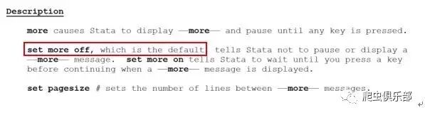 但是在Stata15中,我们可以告别set more off了。因为在Stata15中more默认就是关闭的,我们可以help more来查看。