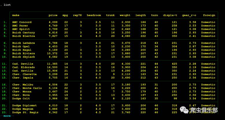 这 里会发现list命令展示的内容并不完整,因为超过了我们在pagesize中设置的行数,这里我们需要点击-more-才会继续显示。因此我们需要加上 set more off这条命令,防止程序执行到中间时停下来。当然如果我们提前输入过set more off, permanently将more永久关闭,在写程序的时候也不需要加上set more off了。