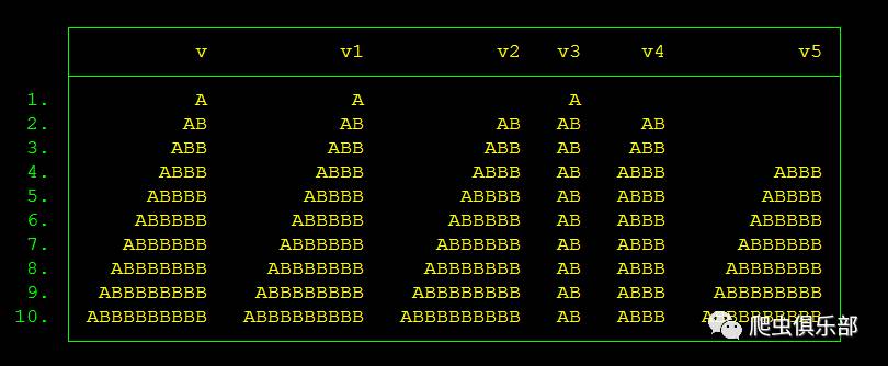 首 先,变量v1是正则表达式"AB*"的匹配结果,元字符“*”为数量元字符,它表示匹配前一个字符或子表达式任意次(这里即表示对字符“B”匹配0次或多 次),我们以变量v中第一条观测值“A”和最后一条观测值“ABBBBBBBBB”为例。对于“A”,正则表达式“AB*”首先对整个字符串“A”进行匹 配,匹配成功,这时候事实上对“B”匹配了0次;对于“ABBBBBBBBB”,正则表达式“AB*”首先岁整个字符串“ABBBBBBBBB”进行匹 配,匹配成功,这里对字符“B”匹配了9次。正则表达式“AB*”的匹配结果可以为A、AB、ABB、ABBB、ABBBB...