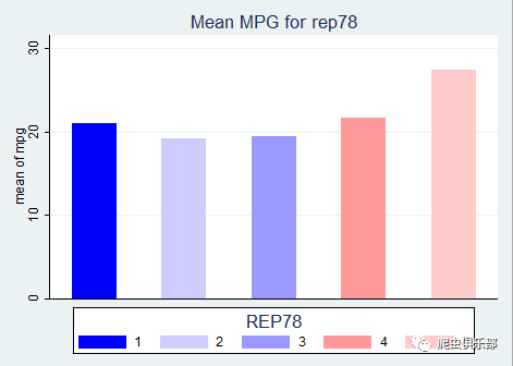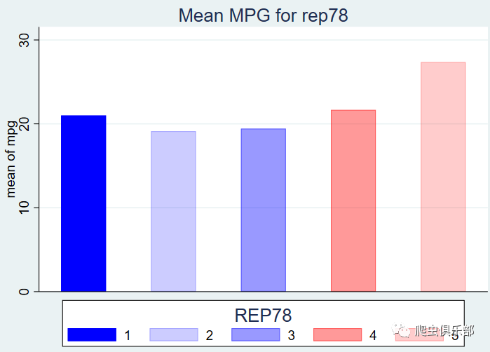 graph bar mpg,asyvars over(rep78) bar(1, bcolor(blue)) ///