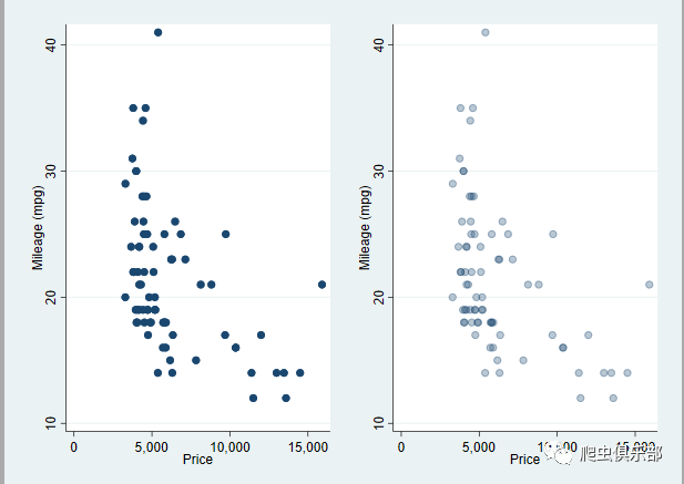 多,这个工作量岂不是很大,而且还都是重复工作。说到这里,可能有人就会想到将图形的颜色变浅一点。在stata14中的确可以做到这一点,我们用系统数