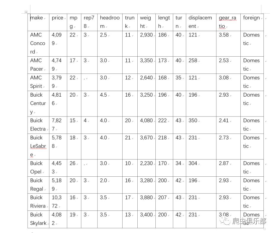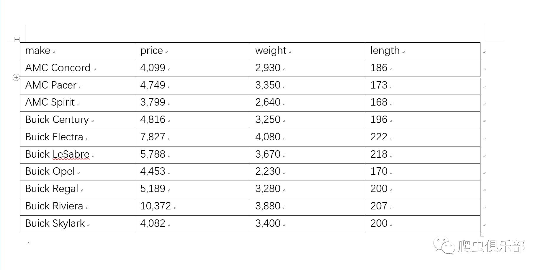 Stata15的推出,为我们带来了putdocx命令,让我们可以用Stata去创建docx文件,也为我们提供了将list结果输出到docx文件的简便方法。例如,我们调用auto数据,输出make price weight length这几个变量前十行,程序如下: