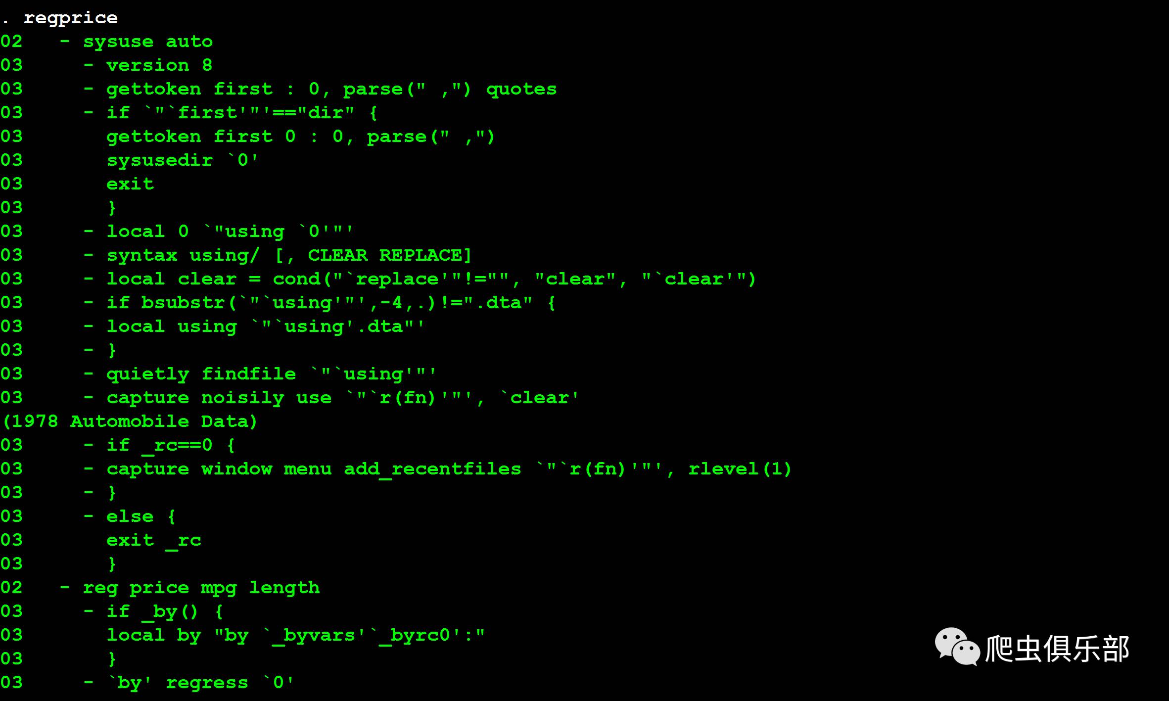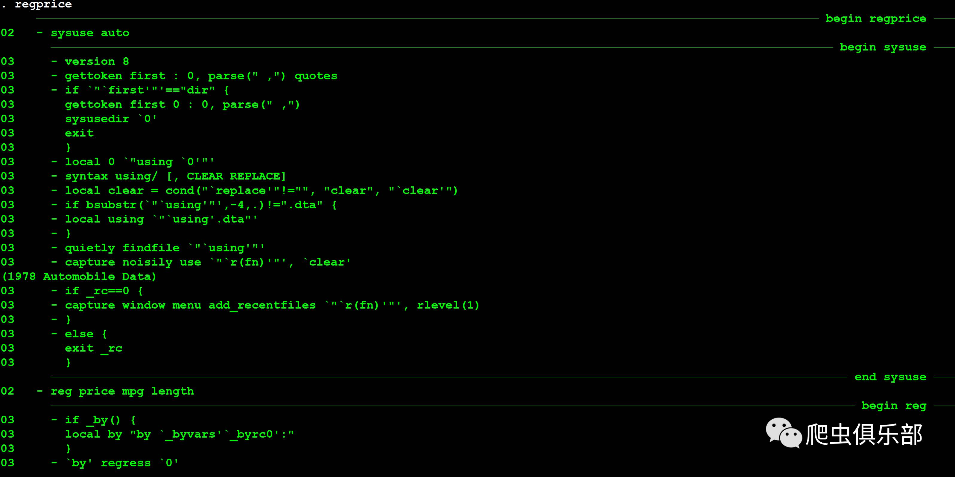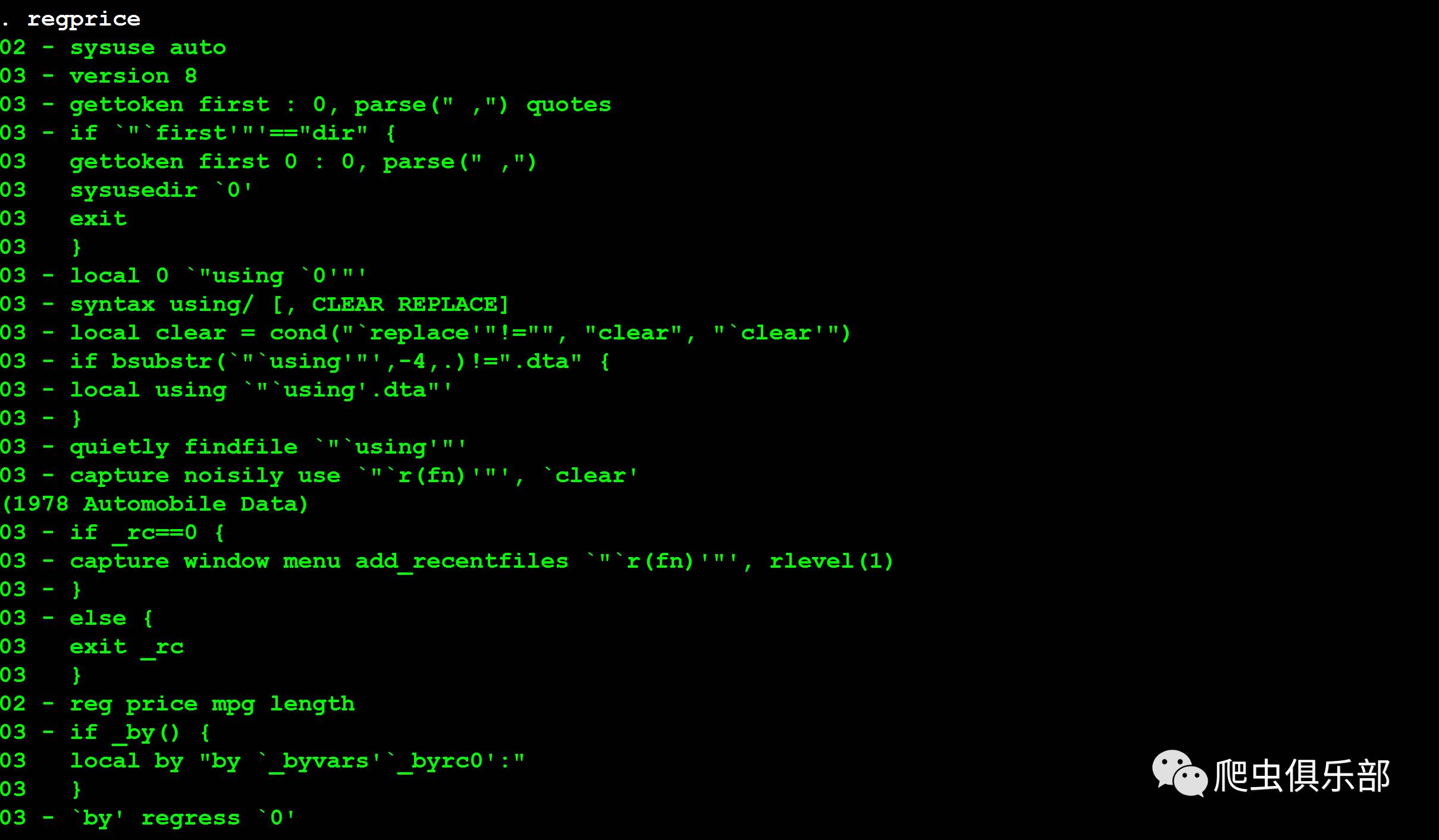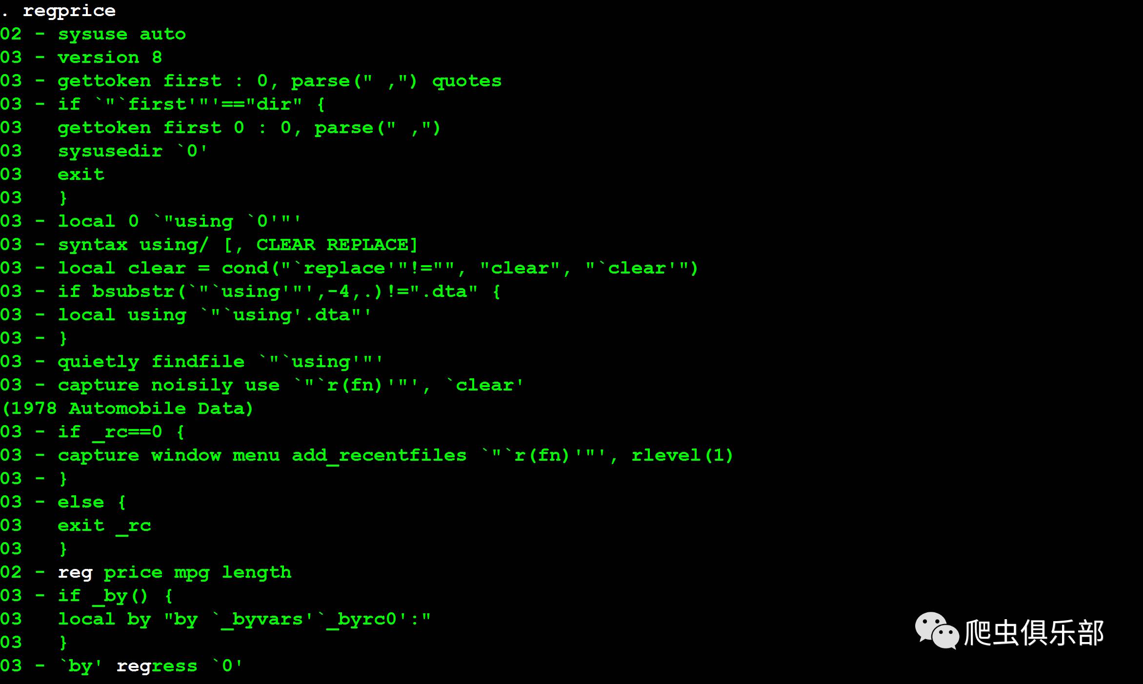 这个时候Stata不仅显示了运行结果,而且告诉我们这一条命令先执行了sysuse auto这一条命令,又执行了reg price mpg length。如果我们改成set tracedepth 2,就可以看到sysuse和reg这两个命令中执行的程序。