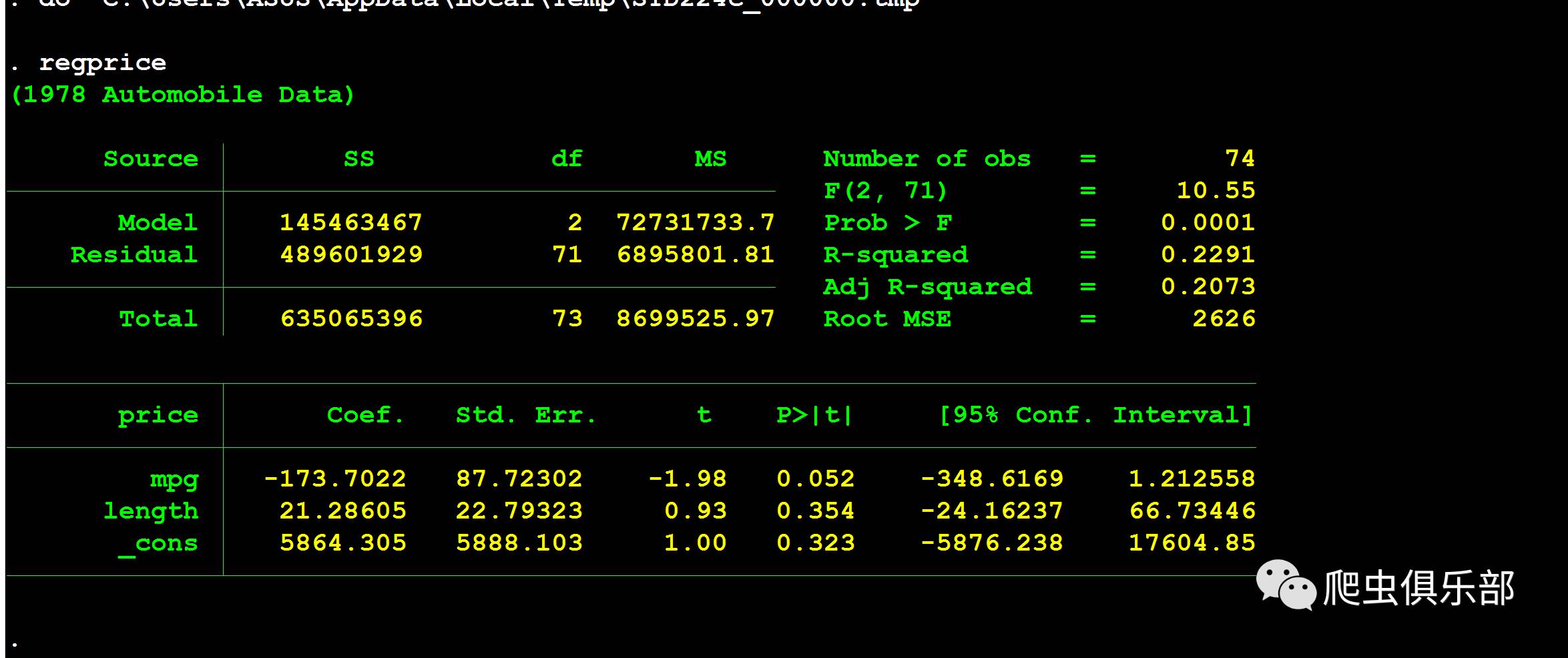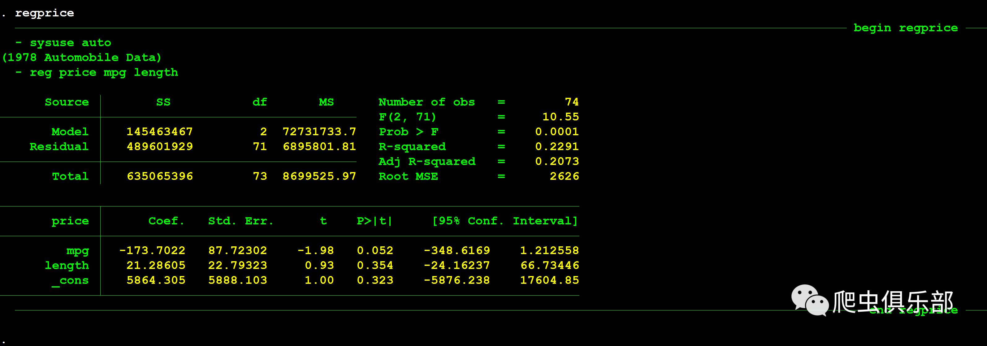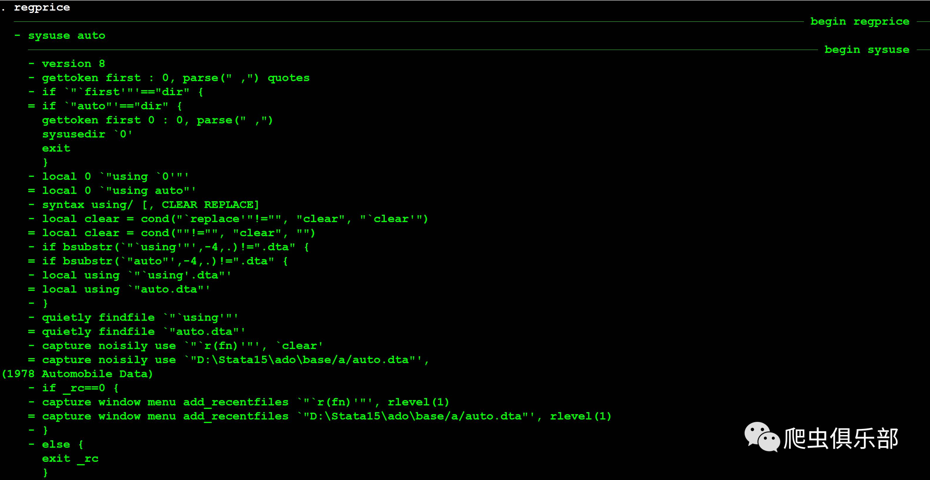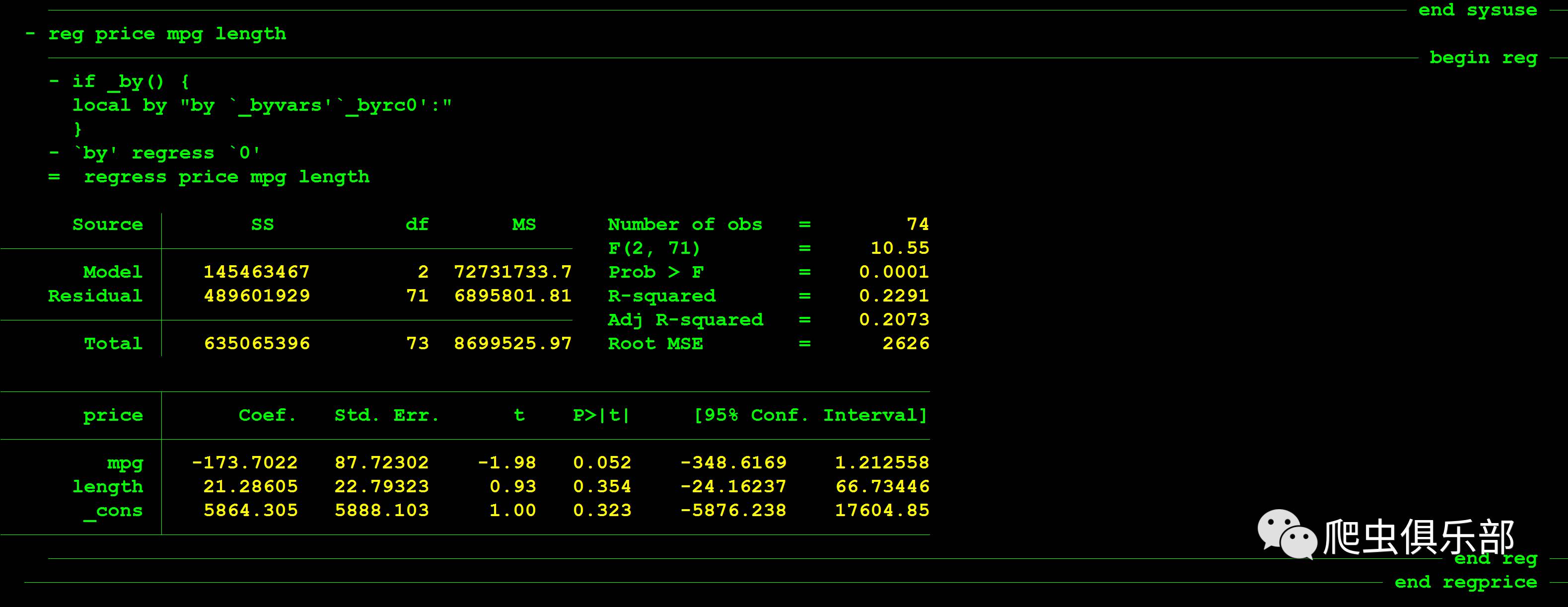 这个时候Stata不仅显示了运行结果,而且告诉我们这一条命令先执行了sysuse auto这一条命令,又执行了reg price mpg length。如果我们改成set tracedepth 2,就可以看到sysuse和reg这两个命令中执行的程序。