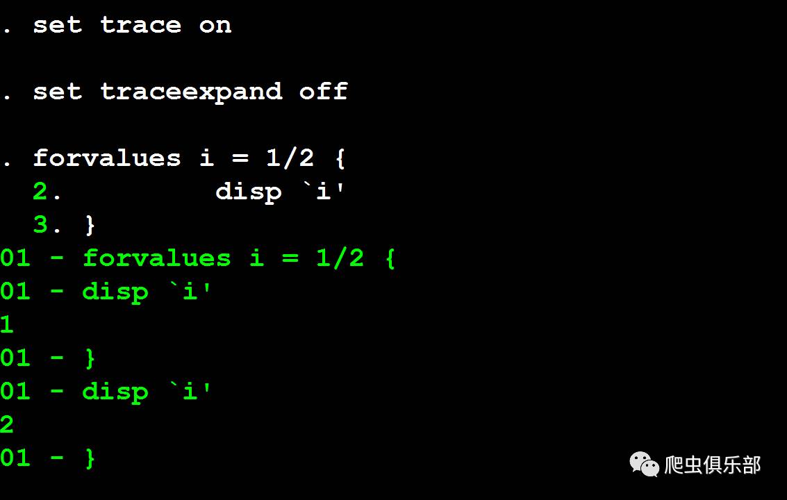 可以看到,每一次执行disp `i'这一行命令时都会告诉我们这一行命令实际的意思,第一次执行是就是disp 1,第二次就是disp 2。如果我们将traceexpand关闭,则会变成这样: