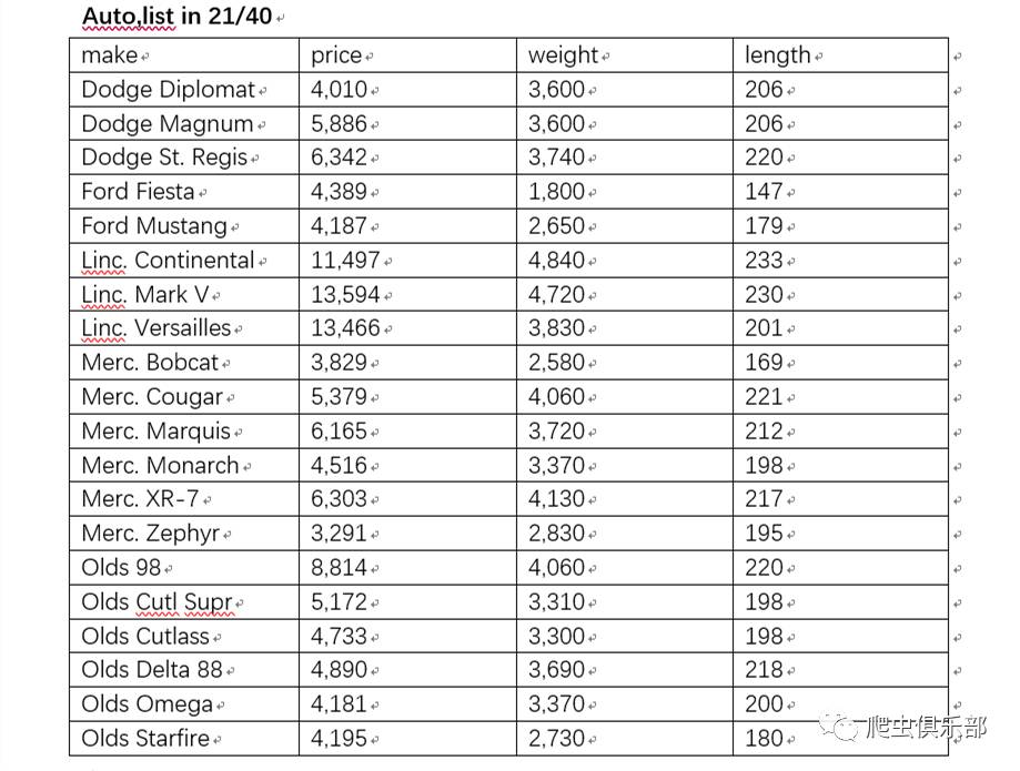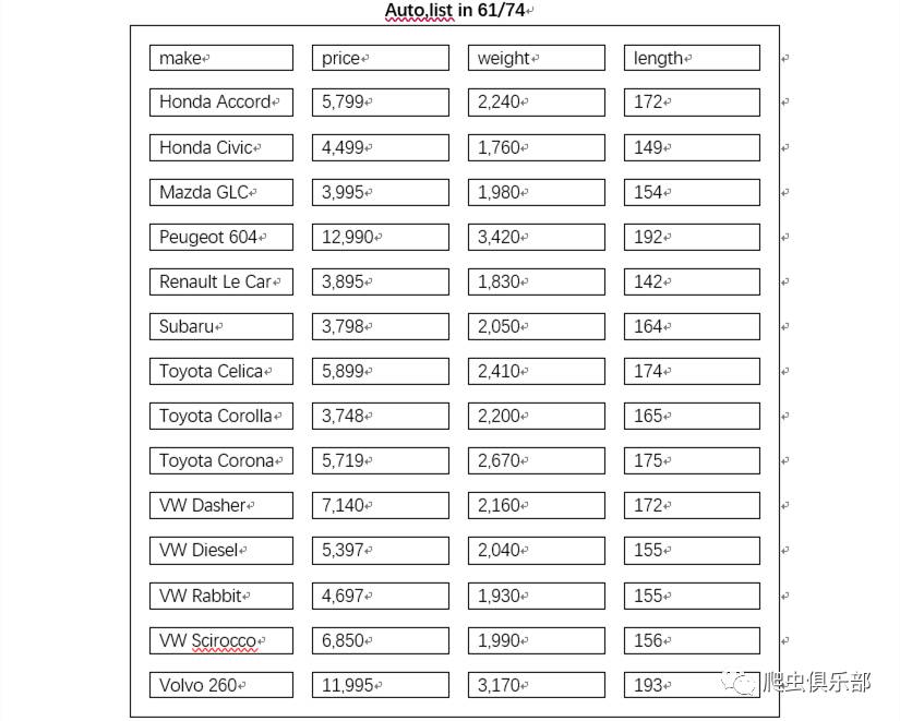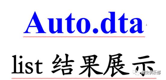 首先,我们输入文本“Auto.dta,list结果展示”,并保存为mytable.docx文件。程序如下: