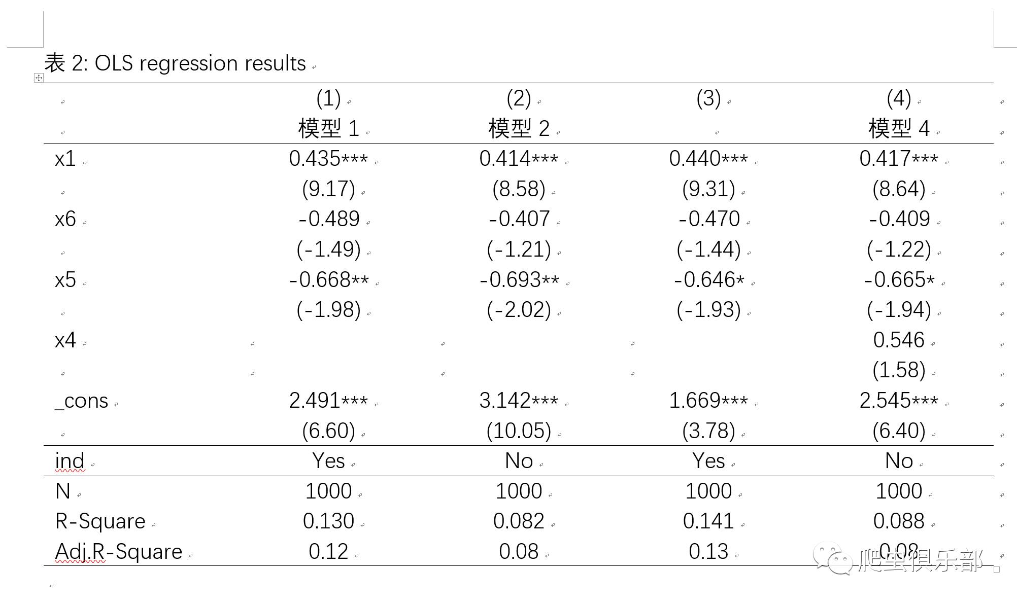 reg2docx m1 m2 m3 m4 using d:/mytable.docx, append indicate("ind=ind*") drop(x2 x3) r2(%9.3f) ar2(%9.2f) order(x1 x6 x5) b(%9.3f) t(%7.2f) title(表2: OLS regression results) mtitles("模型 1" "模型 2" "" "模型 4")