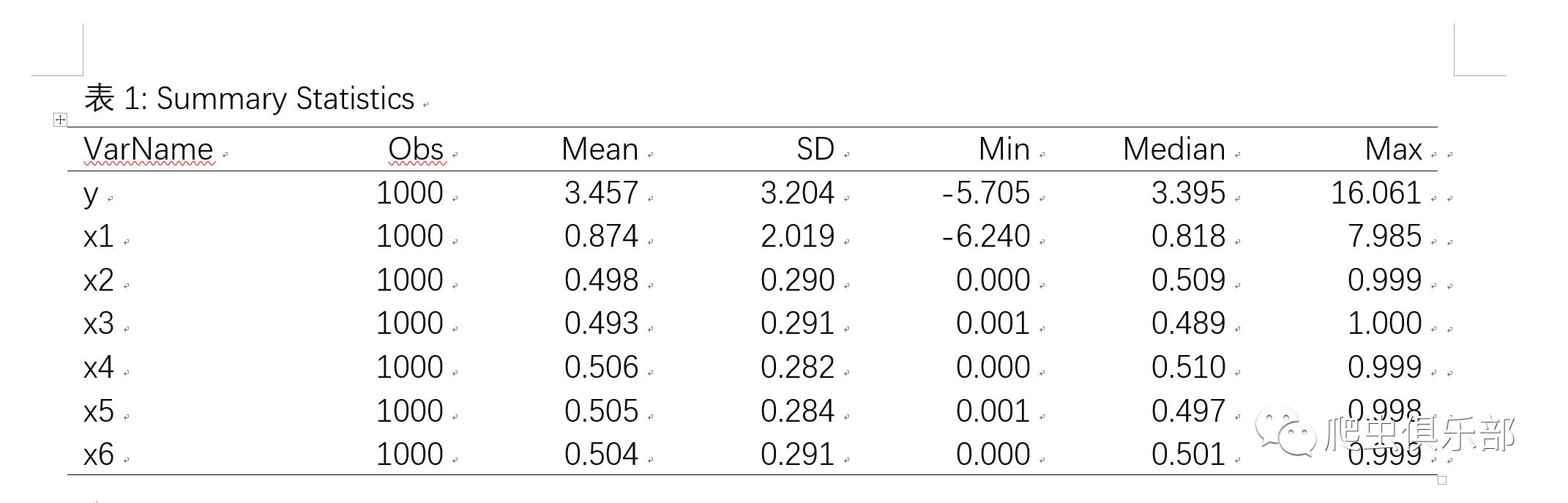 sum2docx y x1-x6 using d:/mytable.docx, append obs mean sd min median max title("表1: Summary Statistics")