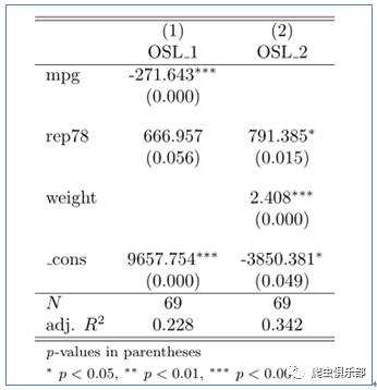 esttab m1 m2 using esttab.tex,mtitle(OSL_1 OSL_2) b(%9.3f) p ar2 noeqlines replace