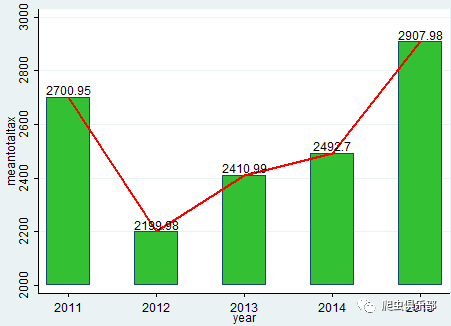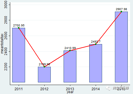 xlabel(2011(1)2015))(scattermeantotaltax year,ylabel(2000(500)4000) ms(none) ///