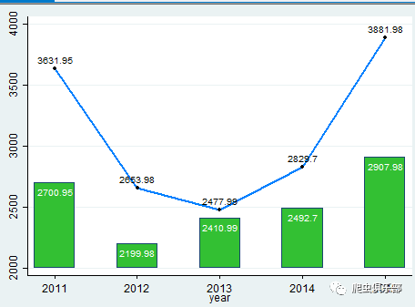 xlabel(2011(1)2015)text(2700.95 2011 "2700.95",placement(12)) text(2199.98 2012 "2199.98"///