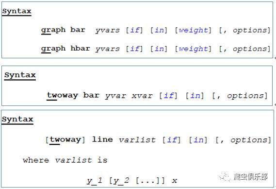 绘制条形图的命令有twoway bar或者graph bar,绘制折线图的命令有twoway line或者直接是line。首先,我们help一下这些绘图命令,正如下图所示的语法结构,要使得条形图和折线图放在同一张图上,我们只能用到命令twoway。