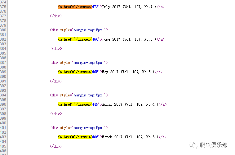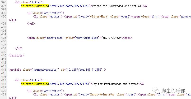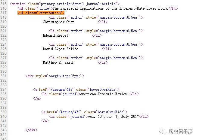 接 着我们开始奇幻的第二步,我们以https://www.aeaweb.org/issues/472为例,先爬取一个期刊号和时间对应的每篇文章链接, 然后加上循环获取所有期刊号和时间所对应的文章链接。我们看下https://www.aeaweb.org/issues/472的源代码: