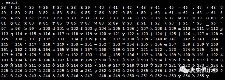 从输出的结果我们可以看到ASCII码是从33开始的,这是因为 ASCII表上的数字0–31分配给了控制字符,此外编码32代表空格键,编码127代表删除键,均为不可显字符,所以无法显示。这样一来我们就可先将ASCII编码(二进制)换成十进制,再对应ascii命令输出的结果,轻松查到编码对应的字符。