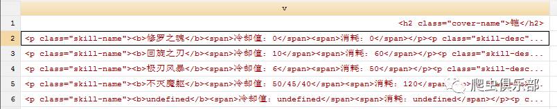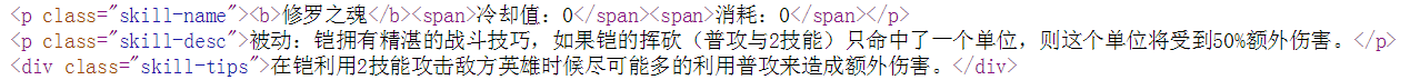 通过匹配"skill-name"、"skill-desc"、"skill-tips"把技能的名称、冷却值、消耗以及技能介绍都筛选出来。