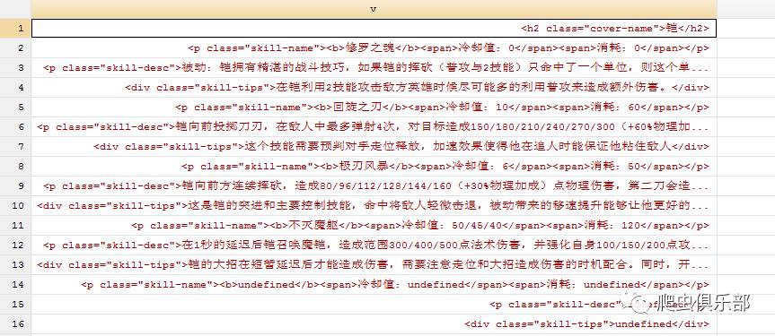 我们发现第一行是英雄名称,从第二行开始,每三行就是一个技能的全部信息,我们可以用一个循环将这三行合并为一行: