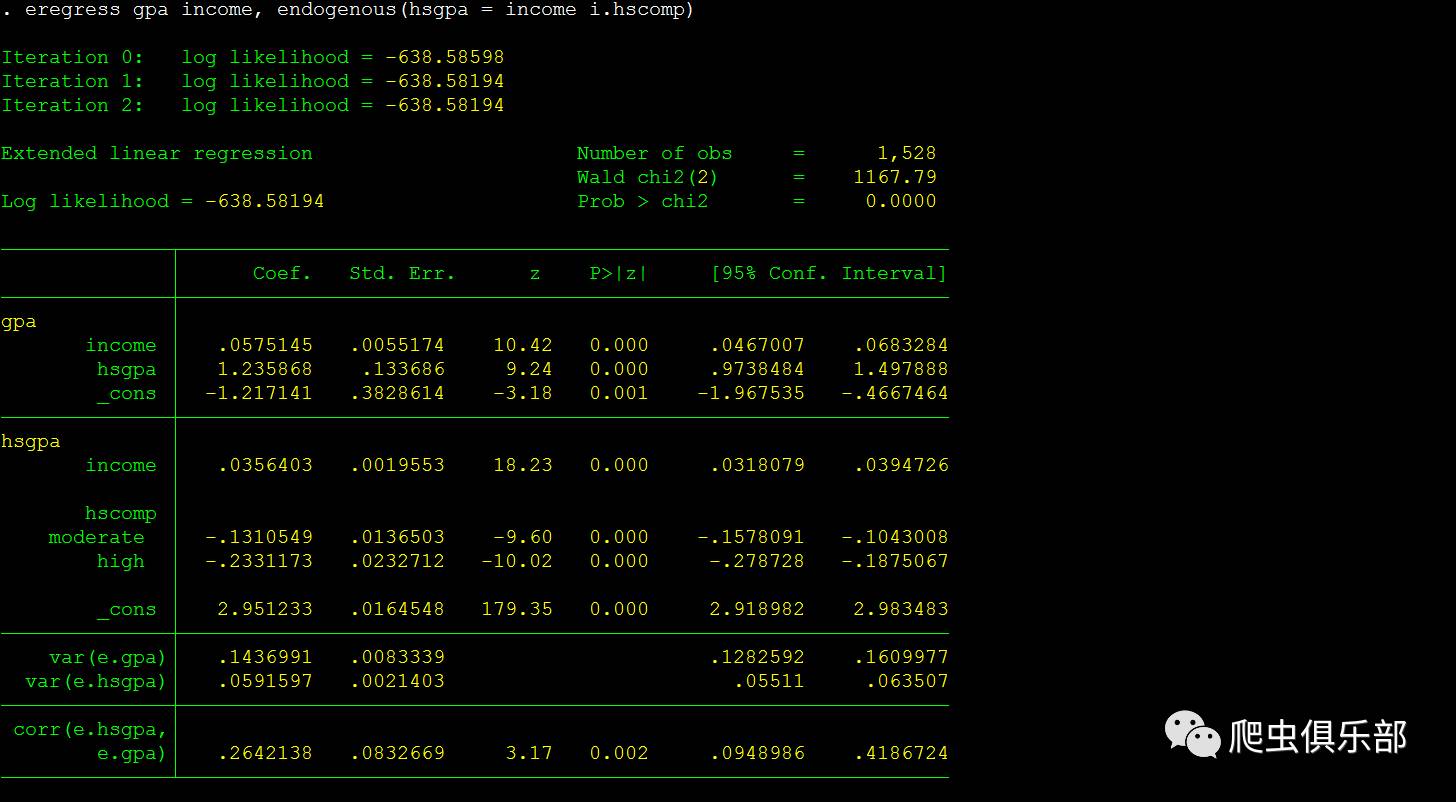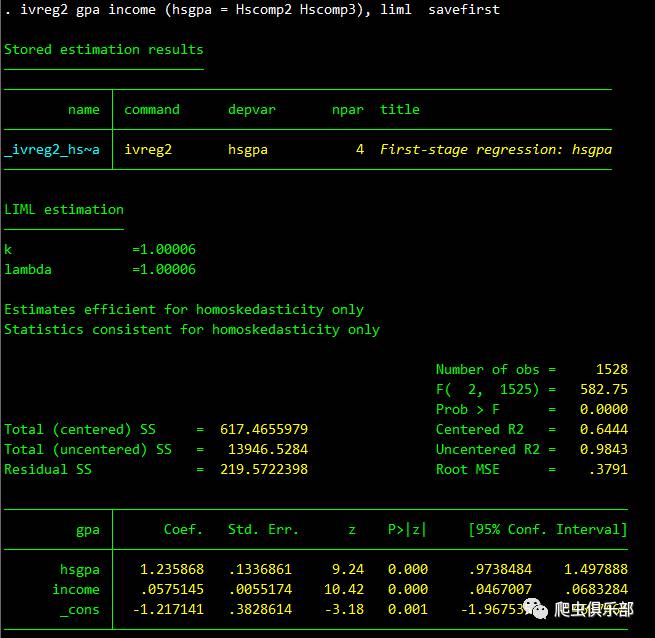 回 归结果表格的上部分,报告了主回归方程的估计结果,被解释变量为gpa;回归结果表格的下部分报告了辅助回归方程的估计结果,被解释变量为hsgpa。在 辅助回归方程中,我们通过引入外生变量hscomp作为hsgpa的工具变量,同时控制income,来控制内生性带来的影响。主回归方程的估计类似于 regress命令,根据回归结果发现高中gpa的不同会导致大学gpa存在1.24的差异。