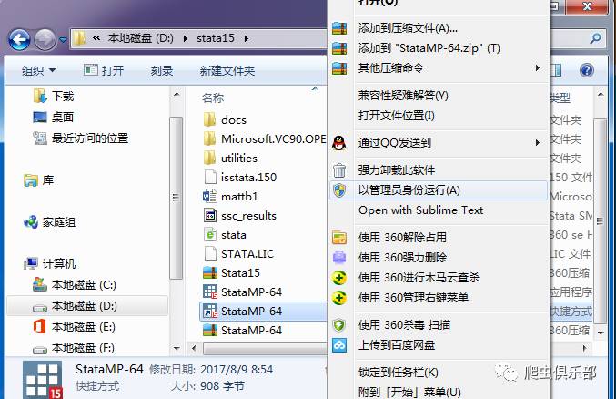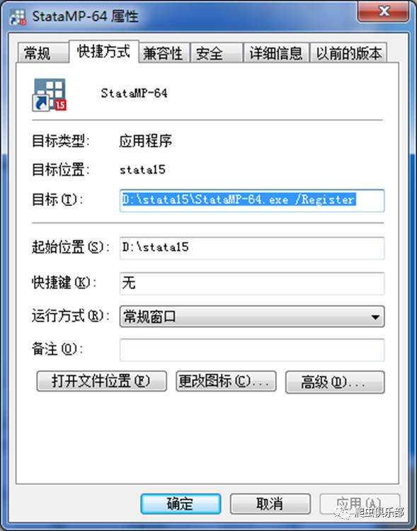 第二步:右键Stata创建快捷方式,右击stata快捷方式,左击属性。在目标中添加/Register,需要注意的是下图“D:\stata15\stataMP-64.exe”与“/Register”之间需要空格隔开。注意这里是“/”。右击快捷方式,选择“以管理员身份运行”。