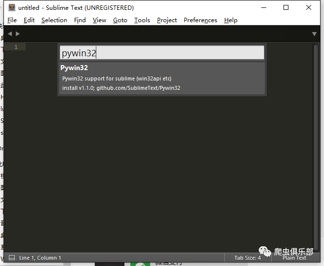 第二步:Preferences>PackageControl>下拉列表:Install Package中输入Pywin32,点击下载。