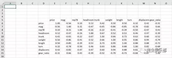 设定从D5单元格开始导入相关系数矩阵,选择项names表示保留矩阵行列名,nfor(number_d2)矩阵中的数值显示两位小数。