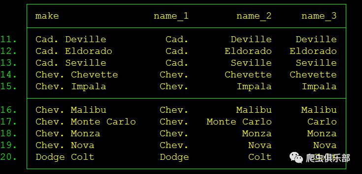 如果不设定punct(),则默认以空格为分隔符。此外,大家可以着重注意一下第十七行的内容”Chev. Monte Carlo”,因为它有两个空格,有助于大家的理解以上的程序。