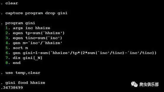 gini food hhsize //命令gini后面键入的第一个变量food的值赋给了宏`inc',第二个变量hhsize 的值赋给了宏`hhsize',计算得到食品的基尼系数