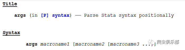 args即argument state,意为参数声明,与之前介绍过的一些命令不同,args是在Stata的程序定义语句中使用的命令。Stata是可编程的,可以实现新的命令,这是通过程序定义语句完成的。在Stata中利用program编写新命令时,如果使用args进行参数声明,它会将执行新命令时用户键入的内容的第一个参数分配给宏macroname1,第二个参数分配给宏macroname2,依此类推,参数由分隔它们的空格定义,我们可以通过将名称包含在单引号中来引用宏的内容,例如:`macroname1'、`macroname2'等等。