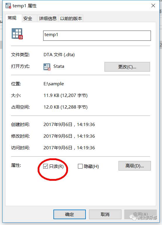 我们右击temp1.dta文件,左击属性,把属性改成只读,再点击确定。