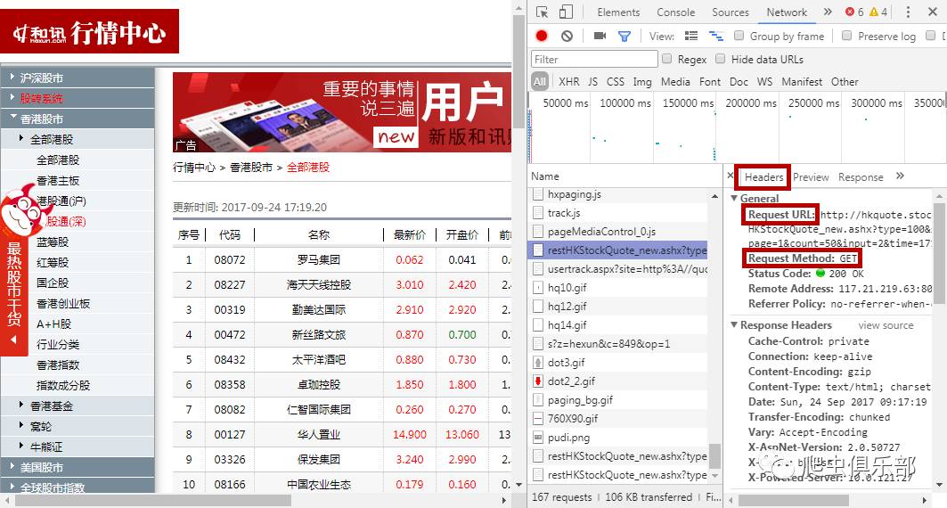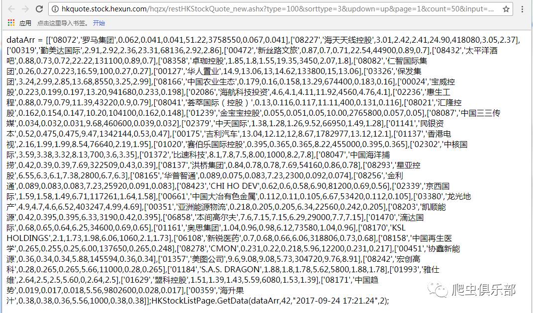 如红色方框标记所示,该网页的请求方式为Get,同时注意到URL地址为:http://hkquote.stock.hexun.com/hqzx/restHKStockQuote_new.ashx?type=100&sorttype=3&updown=up&page=1&count=50&input=2&time=171700,将其粘贴复制到浏览器中打开,打开后显示的即为我们需要的信息,如图: