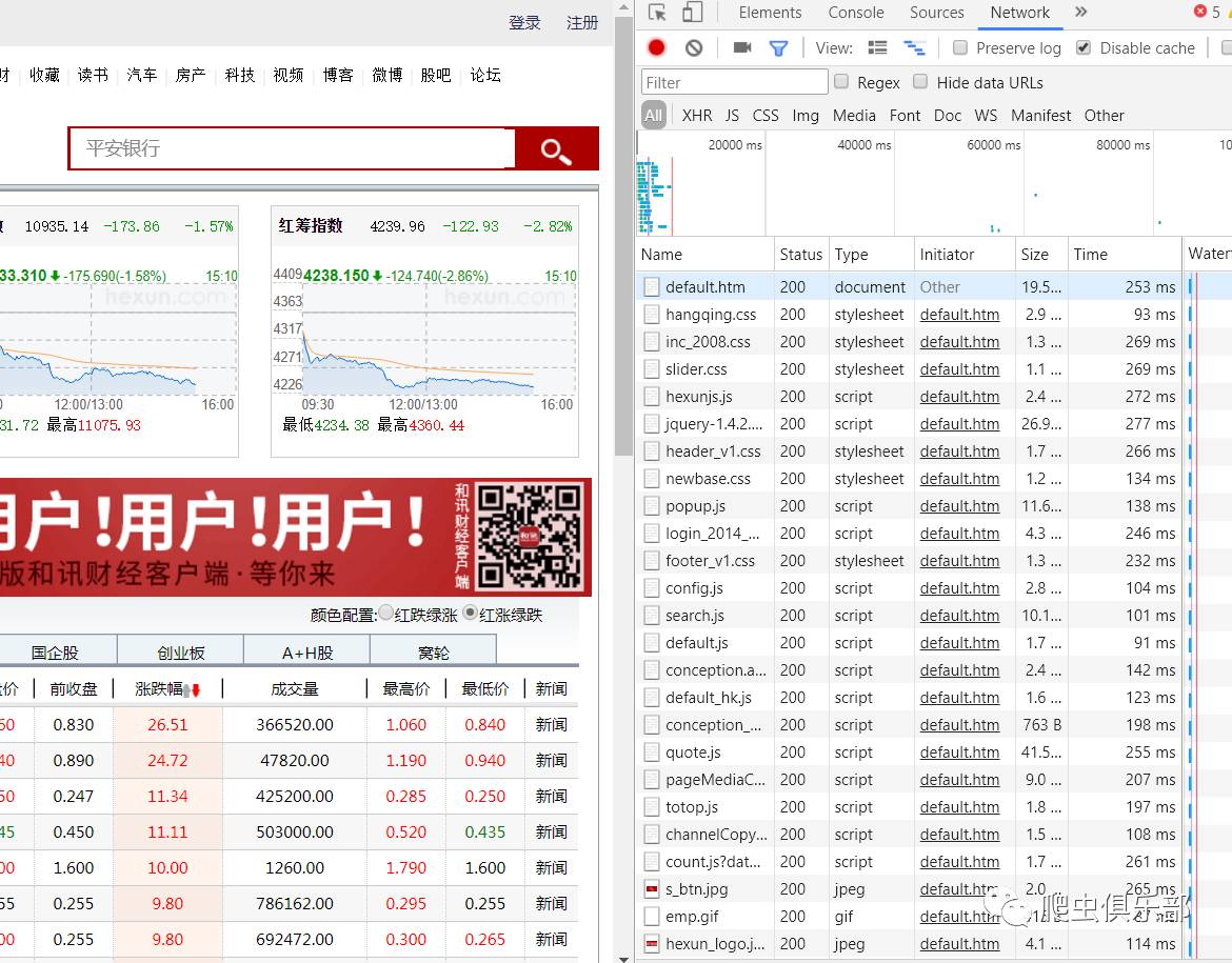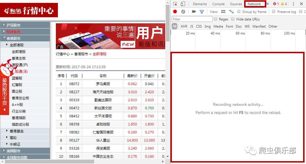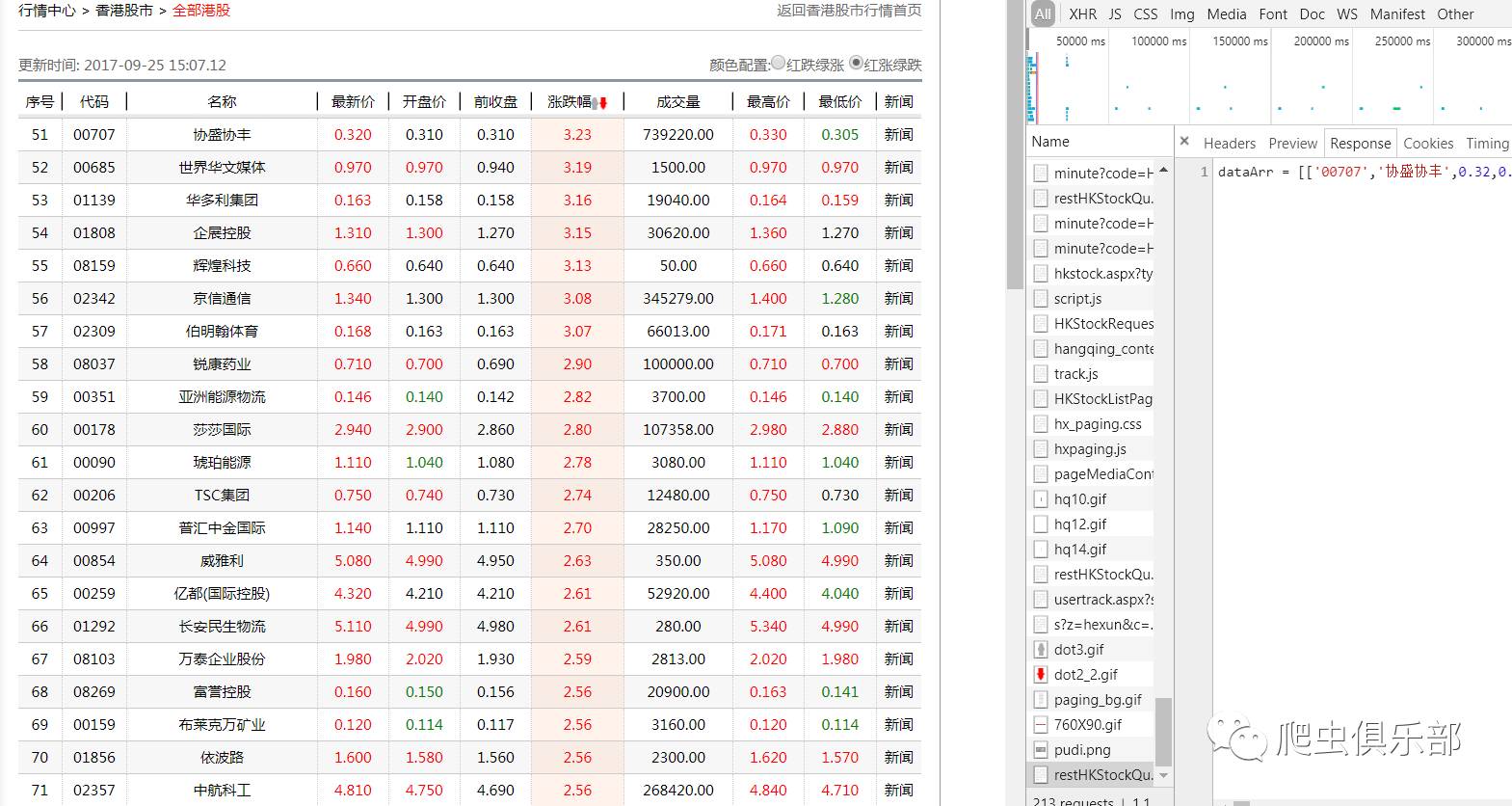 2.对于gif、jpeg等格式一般没有我们需要的信息,js、document等格式一般含有我们需要的信息。我们可以按照这个“规则”更快的筛选出网页的真实链接。对于这个网页,我们可以点击网页左侧的选项--全部港股,然后点击下方下一页,此时在工具列表底部会弹出一个新的网页链接,点击这个链接,查看它的Response即返回信息,发现其返回信息和我们所分析的网页的信息相同,这就是我们所需信息对应的真实链接,如下图: