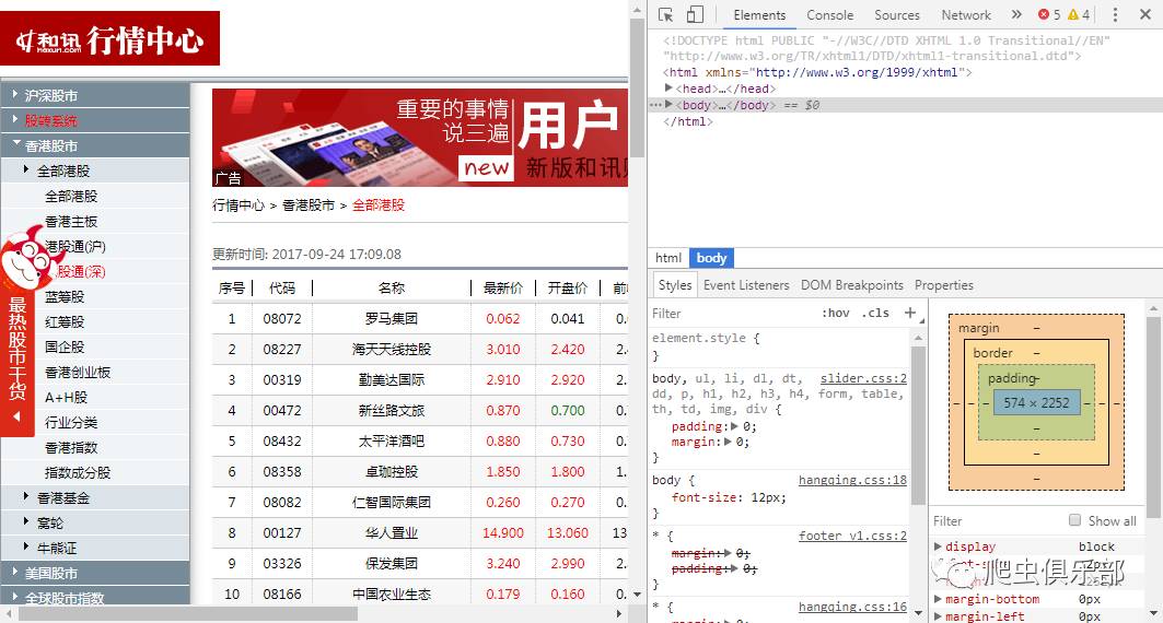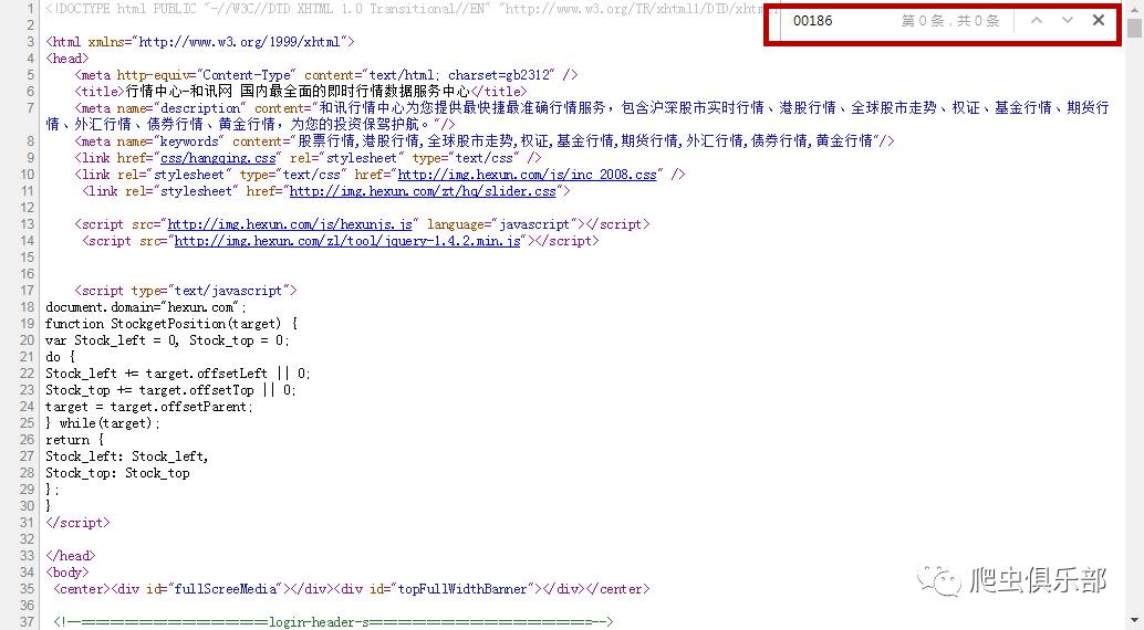 我们以和讯网中全部港股的网页为例( http://quote.hexun.com/default.htm#hkstock),该网页中无论点击哪一页,它的网址都是相同的。同时还注意到,在网页中点击右键查看网页源代码时,无法找到目标信息,比如网页中名为GRANDE HOLDINGS的港股的代码为00186,但是在网页源代码中无法查找到关于00186的信息。如图: